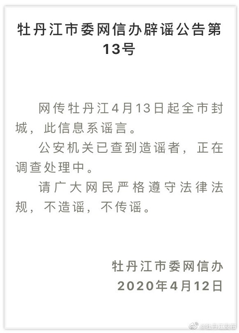 網(wǎng)傳牡丹江4月13日起全市封城,此信息系謠言。公安機(jī)關(guān)已查到造謠者,正在調(diào)查處理中。請廣大網(wǎng)民嚴(yán)格遵守法律法規(guī),不造謠,不傳謠。