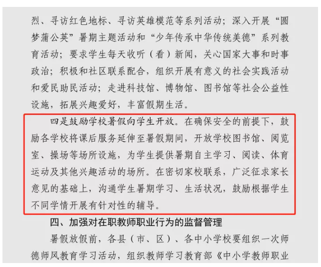 河南省安陽(yáng)市教育局表示,充分考慮到暑假師生的身心狀況,每天時(shí)間總量不超過(guò)4小時(shí),總時(shí)間不超過(guò)四周。在放假后和開(kāi)學(xué)前均留出10天左右的休息時(shí)間,讓老師和學(xué)生有放松期和調(diào)整期。