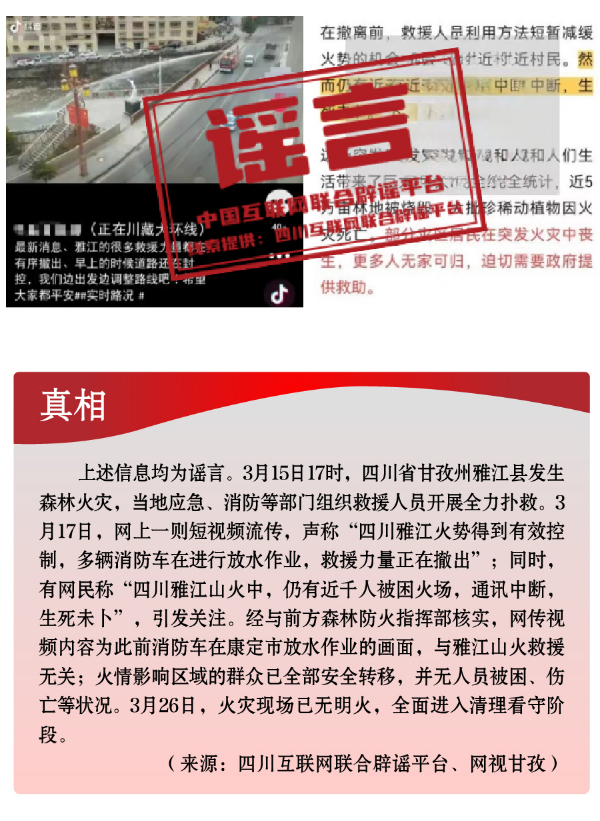 為博流量炮制安全類謠言,引發(fā)恐慌。春季歷來是森林火災(zāi)高發(fā)時段。加之開春后,工廠企業(yè)復(fù)產(chǎn)復(fù)工,致災(zāi)因素明顯增多。3月,全國多地發(fā)生火災(zāi)事故,一些網(wǎng)民為蹭熱點、博流量,趁機編織謠言,引發(fā)公眾恐慌。3月中旬,四川省甘孜州雅江縣發(fā)生森林火災(zāi),在當(dāng)?shù)貞?yīng)急、消防等部門組織救援人員全力撲救之際,卻有人編造“四川雅江山火救援力量正在撤出”“雅江仍有近千人被困火場”“雅江山火有三名撲火人員犧牲”等失實信息,嚴(yán)重干擾災(zāi)害應(yīng)急響應(yīng)和救援工作?!爸貞c南坪商業(yè)大樓火災(zāi)傷亡慘重”“湖南省長沙市天心區(qū)發(fā)生重大刑案,警方發(fā)布懸賞通告”“天津一銀行發(fā)生搶劫”等嚴(yán)重失實的涉公共安全類視頻流傳網(wǎng)絡(luò),或是造謠者自編自導(dǎo),或是利用AI技術(shù)偽造,卻引發(fā)群眾恐慌、造成惡劣影響。此外,“綠得發(fā)黑的菠菜不能吃”“清明蔗、毒過蛇”等食品安全類謠言,則是利用了時令和人們對食物中毒的擔(dān)憂情緒,夸大其詞、危言聳聽,目的都是販賣焦慮、制造恐慌,進而吸引眼球、騙取流量。