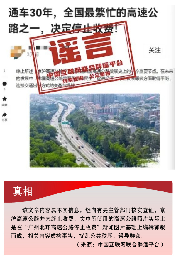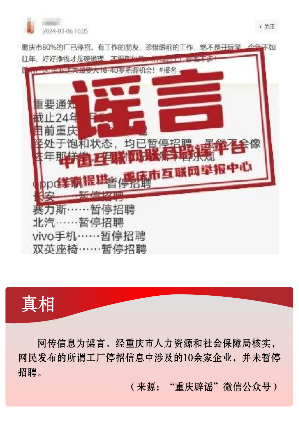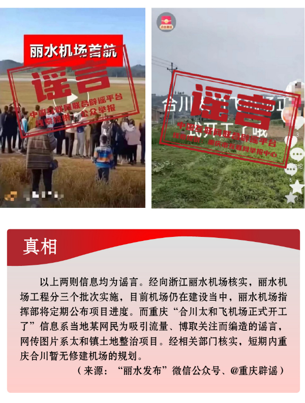 搭蹭熱點散播民生類謠言,渲染焦慮。3月,全國兩會召開,“民生清單”熱度高?!按赫小薄按河巍钡葧r間節(jié)點,有關(guān)招工就業(yè)、疫病傳染等內(nèi)容也成為個別網(wǎng)民博眼球的素材。一些個人或自媒體歪曲甚或虛構(gòu)事實,編造散布社會民生謠言,引發(fā)公眾不必要的焦慮。如,別有用心者惡意虛構(gòu)事實,發(fā)布“重慶80%的工廠暫停招聘”“湖南郴州疫情卷土重來”等虛假信息,渲染負面情緒、徒增公眾憂慮、擾亂社會秩序;還有人為吸引流量、博取關(guān)注,根據(jù)主觀臆想,采取移花接木等手段,散播“京滬高速公路停止收費”“浙江麗水機場已建成投用并首航”“重慶合川太和飛機場正式開建”等涉重大基礎(chǔ)設(shè)施建設(shè)項目的假消息,誤導(dǎo)公眾認知,擾亂群眾交通出行秩序。