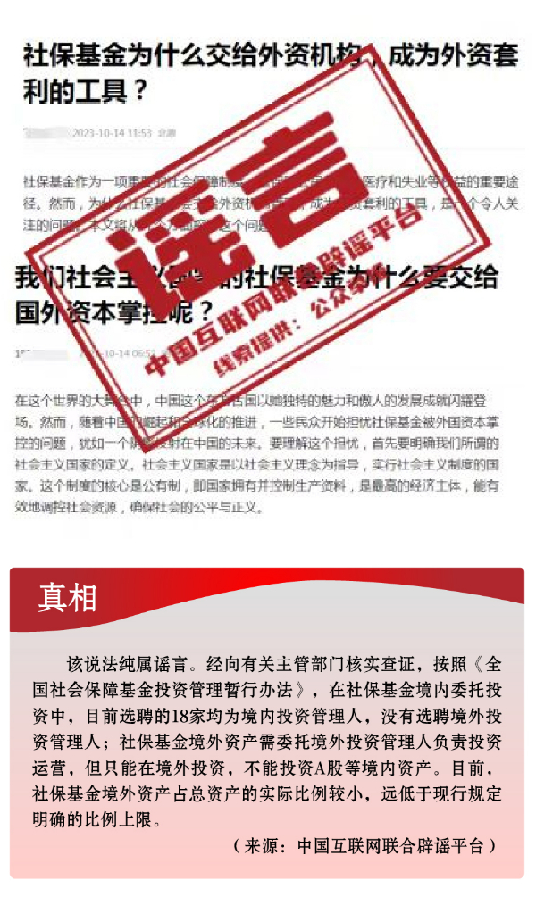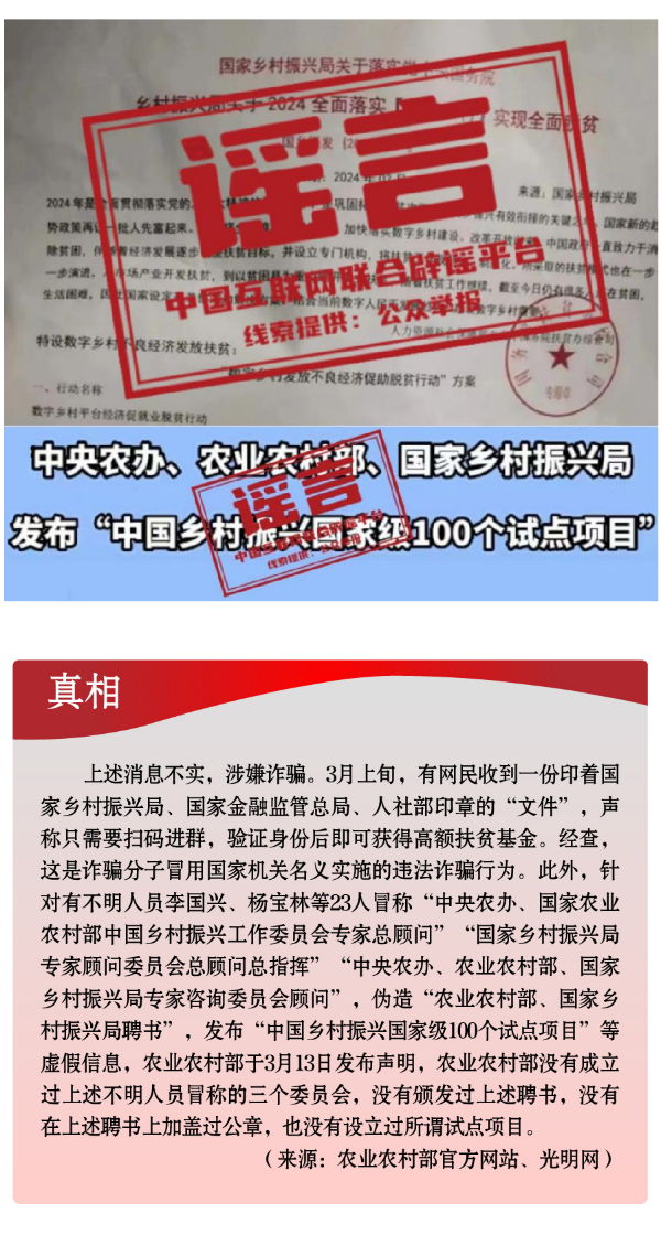 假冒權(quán)威杜撰政策類謠言,誤導(dǎo)公眾。3月以來,一些不法分子或機構(gòu)打著權(quán)威旗號,假冒國家機關(guān)、偽造政府公文、歪曲解讀政策,企圖行騙牟利。如,詐騙分子冒用國家機關(guān)名義,假稱“國家發(fā)放2024年鄉(xiāng)村振興扶貧補貼”“鄉(xiāng)村振興項目有國家級試點100個”“‘退稅綠色通道’加快退稅到賬速度”等,實施違法詐騙行為,給社會公眾造成極大信息和資金安全風(fēng)險。還有人制造、傳播“我國城鄉(xiāng)居民醫(yī)保參保人數(shù)近年來持續(xù)下降,部分地區(qū)農(nóng)村出現(xiàn)醫(yī)保退保潮”“失業(yè)保險金只能領(lǐng)一次,最多領(lǐng)24個月”“我國社?;鹑冀唤o外資機構(gòu)管理”等一系列與事實嚴(yán)重不符的涉公共謠言,迷惑性大、蠱惑性強,極易誤導(dǎo)公眾,對我國現(xiàn)有社保政策和相關(guān)工作造成負面影響。
