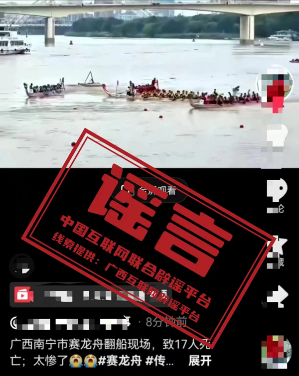 真相:近日,有網(wǎng)友在短視頻平臺(tái)發(fā)視頻稱“南寧市賽龍舟翻船致人員傷亡”。經(jīng)廣西壯族自治區(qū)南寧市互聯(lián)網(wǎng)舉報(bào)辟謠平臺(tái)向南寧市體育局核實(shí),大賽期間,南寧市紅十字會(huì)、南寧市應(yīng)急管理局和消防救援支隊(duì)安排50余名持有救生員資格證的救生人員、10臺(tái)救生艇隨時(shí)待命,比賽期間發(fā)生賽艇傾覆的緊急情況后,應(yīng)急救援隊(duì)第一時(shí)間組織救援力量開展施救,成功地將傾覆的賽艇和落水運(yùn)動(dòng)員一一救起,未致人員傷亡。網(wǎng)傳“南寧市賽龍舟翻船致人員傷亡”系謠言。(來源:廣西互聯(lián)網(wǎng)違法和不良信息舉報(bào)、“南寧舉報(bào)辟謠”微信公眾號(hào))