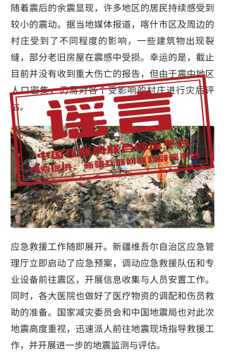 真相:近日,有網(wǎng)民發(fā)布帖文稱“新疆喀什市7月22日發(fā)生6.3級地震,周邊村莊建筑出現(xiàn)裂痕,部分老舊房屋在震感中受損……”。經(jīng)新疆喀什市應(yīng)急管理局證實(shí),當(dāng)日喀什市域內(nèi)未發(fā)生地震,中國地震臺網(wǎng)也未發(fā)布喀什當(dāng)日發(fā)生地震的相關(guān)信息,此信息為虛假內(nèi)容。(來源:網(wǎng)信新疆、新疆喀什網(wǎng)絡(luò)舉報(bào))