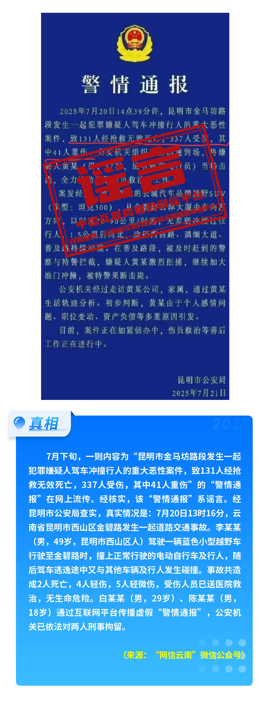 近期,網(wǎng)上接連出現(xiàn)發(fā)布虛假“警情通報(bào)”的惡性造謠傳謠案件,炮制傳播“昆明駕車撞人案131人死亡”“杭州自來(lái)水接入糞水”及涉釋永信虛假“警情通報(bào)”,模仿“藍(lán)底白字”格式,杜撰聳人聽(tīng)聞細(xì)節(jié),損害政府公信力,嚴(yán)重?cái)_亂社會(huì)秩序?!霸菏款A(yù)測(cè)廣東將發(fā)生8級(jí)以上大地震”公然偽造專家聊天截圖,謊報(bào)地震預(yù)警。還有造謠者借盛夏高溫酷暑與洪澇災(zāi)害,編造“安徽淮北、山東泰安等地多人因高溫死亡” “重慶大暴雨導(dǎo)致15人死亡、4人失蹤”等謠言,蹭炒熱點(diǎn)、煽動(dòng)情緒。