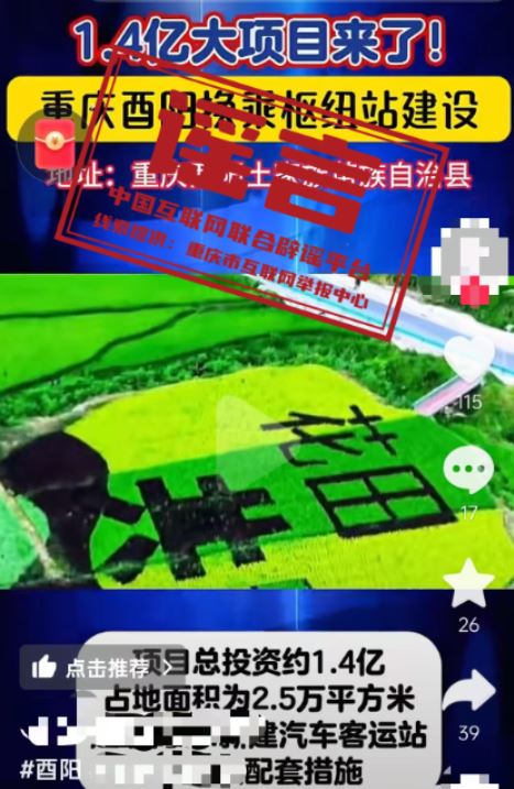 真相:近日,有網(wǎng)民發(fā)布信息稱(chēng)“1.4億大項(xiàng)目來(lái)了,重慶酉陽(yáng)換乘樞紐站建設(shè),新建汽車(chē)客運(yùn)站及相關(guān)配套”,引發(fā)關(guān)注。經(jīng)重慶市酉陽(yáng)縣交通運(yùn)輸委核實(shí),酉陽(yáng)縣正在推進(jìn)桃花源景區(qū)游客集散中心提升項(xiàng)目,暫無(wú)“1.4億建設(shè)換乘樞紐站”項(xiàng)目,網(wǎng)傳信息系謠言。(來(lái)源:“重慶辟謠”微信公眾號(hào))