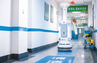 在四川德陽(yáng)市人民醫(yī)院拍攝的工作中的鈦米消毒機(jī)器人。新華社發(fā)