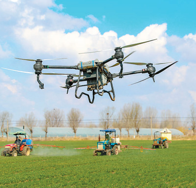 3月16日,山東青島萊西市沽河街道,植保無(wú)人機(jī)、長(zhǎng)臂噴霧機(jī)在田間對(duì)小麥進(jìn)行管護(hù)。張進(jìn)剛攝(人民視覺(jué))