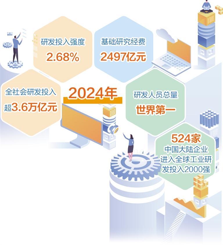 科技投入持續(xù)增加。2024年全社會研發(fā)投入超3.6萬億元,較2020年增長48%;研發(fā)投入強度達2.68%,超過歐盟國家平均水平;研發(fā)人員總量世界第一?;A(chǔ)研究經(jīng)費達2497億元,較2020年增長超過70%,在量子科技、生命科學(xué)、物質(zhì)科學(xué)、空間科學(xué)等領(lǐng)域取得一批重大原創(chuàng)性成果,高水平國際期刊論文數(shù)量和國際專利申請量連續(xù)5年世界第一。