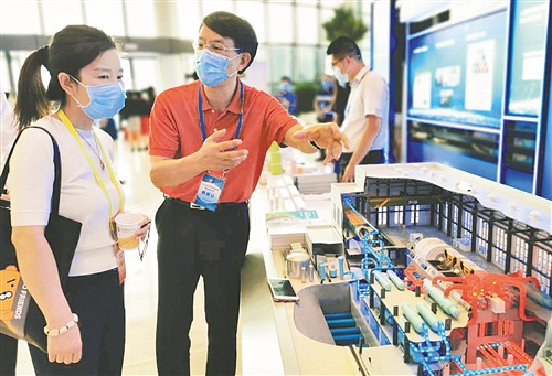 國(guó)家電投集團(tuán)的專家在模型前向參觀者介紹國(guó)家科技重大專項(xiàng)成果——國(guó)和一號(hào)(CAP1400)壓水堆核電站。經(jīng)濟(jì)日?qǐng)?bào)記者 佘惠敏攝