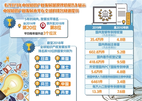 9月14日,中國國家知識(shí)產(chǎn)權(quán)局知識(shí)產(chǎn)權(quán)發(fā)展研究中心發(fā)布的《2019年中國知識(shí)產(chǎn)權(quán)發(fā)展?fàn)顩r評(píng)價(jià)報(bào)告》顯示,中國知識(shí)產(chǎn)權(quán)發(fā)展水平在全球的排名快速提升,短短5年時(shí)間內(nèi),排名已從2014年的第20位,快速躍升至2018年的第8位,平均每年提升近3個(gè)位次。