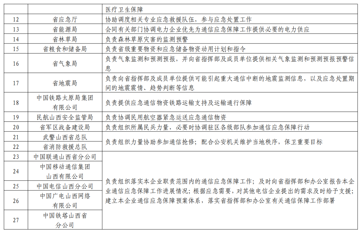 成員:省通信管理局、省委宣傳部、省委網(wǎng)信辦、省發(fā)展改革委、省公安廳、省財政廳、省自然資源廳、省交通廳、省水利廳、省衛(wèi)健委、省應(yīng)急廳、省能源局、省林草局、省糧食和儲備局、省氣象局、省地震局、中國鐵路太原局集團有限公司、民航山西安全監(jiān)管局、省軍區(qū)戰(zhàn)備建設(shè)局、武警山西省總隊、省消防救援總隊以及省基礎(chǔ)電信企業(yè)等部門單位相關(guān)負責(zé)人。