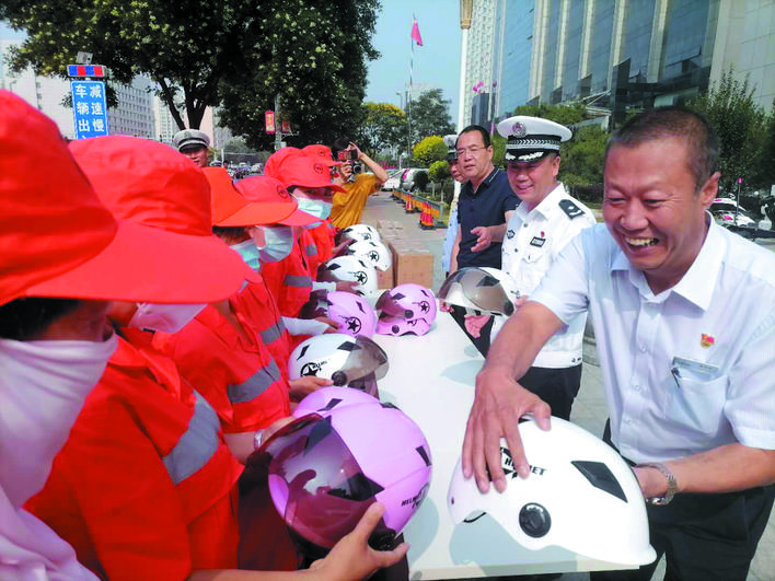 本報訊 為響應(yīng)全省開展的“一盔一帶”安全守護行動,助推我市創(chuàng)建全國文明城市, 7月23日上午,市公安局交警支隊聯(lián)合忻州農(nóng)村商業(yè)銀行,開展“護航交通安全 助力文明創(chuàng)建”活動,給城區(qū)1000余名一線環(huán)衛(wèi)工人送上愛心安全頭盔,希望他們在工作中注意安全、保護好自己,更好地投入工作、扮靚市容。