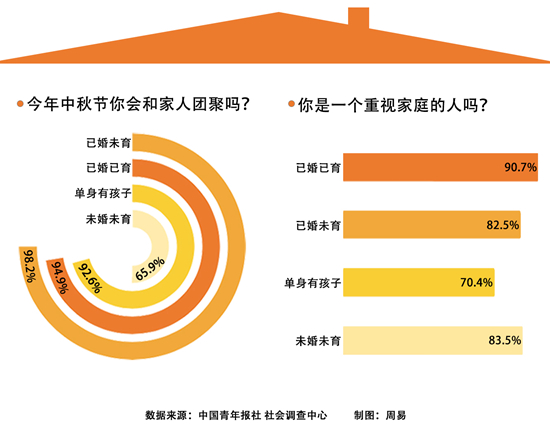 調查顯示,今年中秋節(jié),92.9%的受訪者會和家人團聚。已婚未育的受訪者這一比例最高(98.2%),未婚未育受訪者這一比例最低(65.9%)。