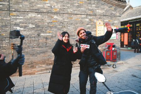 龍祥鳳瑞迎新春、龍躍鳳舞鬧新春、龍章鳳彩賀新春,熱鬧的平遙中國(guó)年吸引不少外國(guó)友人來(lái)打卡,吃美食、看文化、當(dāng)回“晉商少奶奶”?!捌竭b古城歷史悠久,是曾經(jīng)的‘中國(guó)華爾街’,在全世界都非常著名,晉商票號(hào)讓人感到震撼?!迸D月廿七中午,剛剛結(jié)束山西大同行程的葡萄牙游客Joao與哥哥來(lái)到平遙古城。Joao是一位中國(guó)歷史愛(ài)好者,談起腳下的平遙古城連連豎起大拇指,“我們特意把平遙的旅程放在春節(jié)這段時(shí)間,要轉(zhuǎn)轉(zhuǎn)古城的歷史遺跡,還要看看古城的特色演出,感受一番地道的中國(guó)年。”