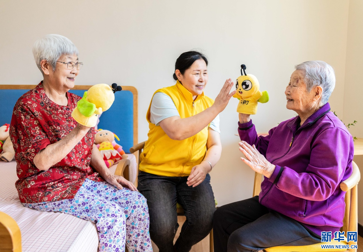 4月8日,工作人員在呼和浩特市玉泉區(qū)居家社區(qū)養(yǎng)老服務(wù)標準化示范中心陪老人做游戲。新華網(wǎng)發(fā)(丁根厚 攝)