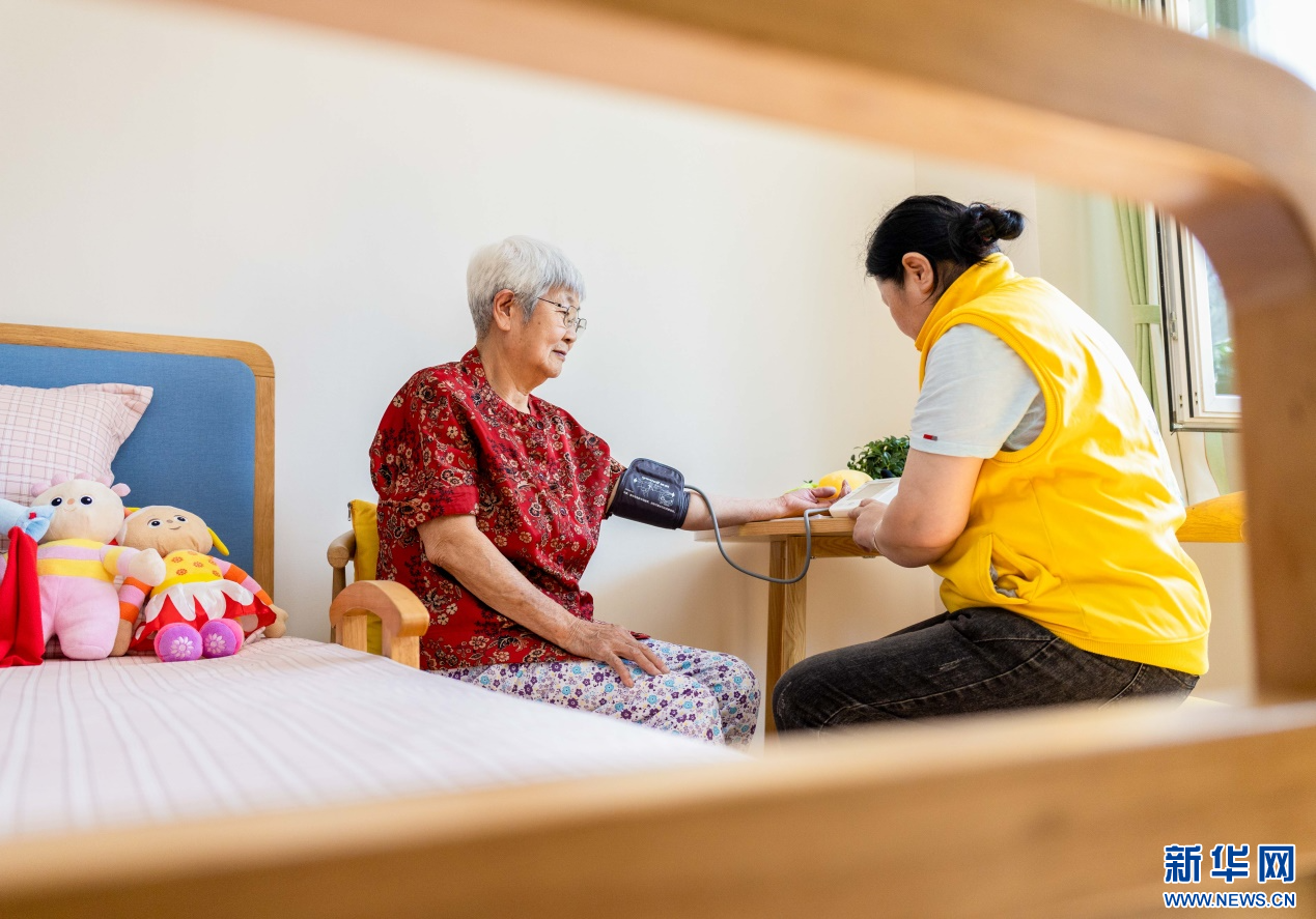 4月8日,工作人員在呼和浩特市玉泉區(qū)居家社區(qū)養(yǎng)老服務(wù)標準化示范中心為老人量血壓。新華網(wǎng)發(fā)(丁根厚 攝)