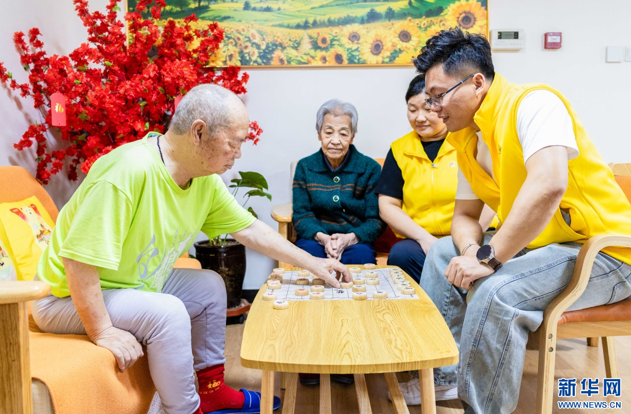 4月8日,工作人員在呼和浩特市玉泉區(qū)居家社區(qū)養(yǎng)老服務(wù)標準化示范中心陪老人下象棋。新華網(wǎng)發(fā)(丁根厚 攝)