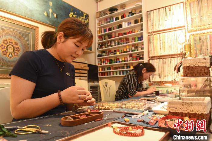 6月12日,在山東煙臺(tái)一家飾品店,編織師傅忙著編織腕飾。曲正揚(yáng) 攝