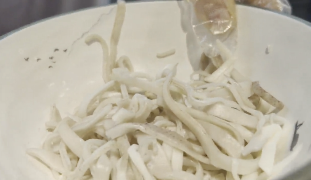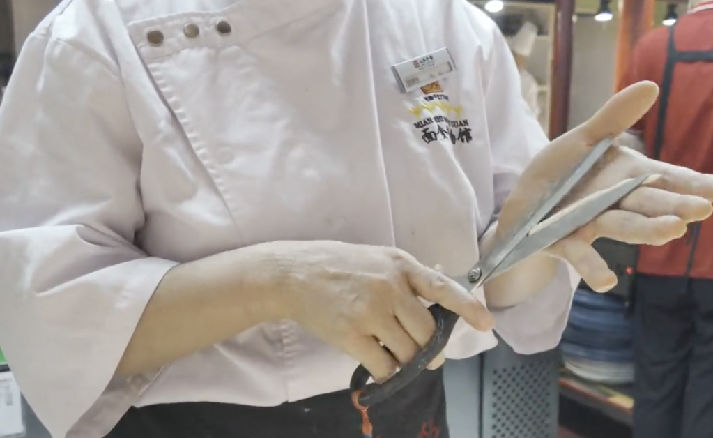 圖為夾心面。新華社記者 王怡靜 攝??關(guān)于剪刀面的故事很動(dòng)人——“‘剪子面,兩頭尖,吃到肚里胃不酸’。相傳剪刀面是以前喬家大院的喬貴發(fā)走西口的時(shí)候,留在家里的妻子為丈夫裁剪衣服,由于過(guò)于思念丈夫,一走神就把剪刀也帶到了廚房里,于是便有了剪子面?!覆凰帷?,其實(shí)也是‘心不酸’?!崩铉f(shuō)。剪刀面一般用來(lái)做湯面,配蔬菜吃,也有著希望家人安康的寄托。