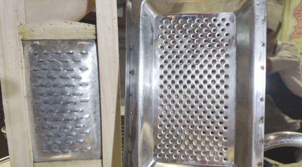 圖為做面工具擦床(左)抿床(右)。新華社記者 王怡靜 攝 當(dāng)然,最好用的工具當(dāng)屬做面的“魔法棒”——手指。用手指將莜面的小面團(tuán)搓成橄欖形,上鍋一蒸,就成了“莜面魚(yú)魚(yú)”;將面團(tuán)放在砧板上,用手掌后部往前推壓成薄片,就成了“栲栳栳”;將面團(tuán)分切成小面丁以后,用大拇指一抿,就成了“貓耳朵”;將小麥面加一兩種雜糧面混勻后和成較軟的面團(tuán),勻速將面擠壓出手指縫,就成了“握流流”。在“魔法棒”的作用下,面團(tuán)變成了各式各樣的美餐,給山西人帶來(lái)了無(wú)盡舌尖上的享受。
