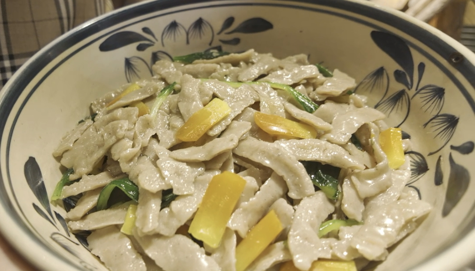圖為紅面擦尖。新華社記者 王怡靜 攝 除形態(tài)外,山西人還擅長(zhǎng)用不同的面粉來(lái)給面食增添樂(lè)趣。除小麥面粉外,各種雜糧面也是山西人廚房里的“??汀?。玉米面、莜面、紅面、蕎面等雜糧面與小麥面粉相比,顆粒感更強(qiáng),也更筋道、有韌性,也更有利于營(yíng)養(yǎng)均衡。雜糧面的做法也有不少花樣,單莜面就有“栲栳栳”“莜面魚(yú)魚(yú)”“莜面旗旗”等多種做法,蕎面還能單獨(dú)做成深受喜愛(ài)的小吃“蕎面碗團(tuán)”。