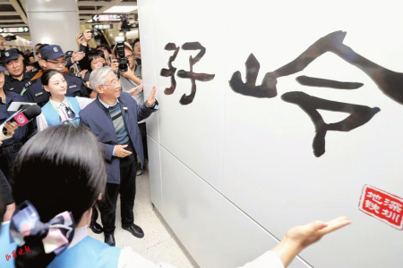 崗廈北站是深圳交通網(wǎng)絡(luò)中的重要節(jié)點(diǎn),設(shè)計(jì)獨(dú)具匠心,通過天井將陽光引入地下,科技感和藝術(shù)性兼具,被譽(yù)為“深圳之眼”。在崗廈北站樞紐的“深圳之眼”下,姥爺即興揮毫,寫下“情滿鵬城”“厚德載運(yùn),深鐵為民”。墨跡未干,照片已登上熱搜。