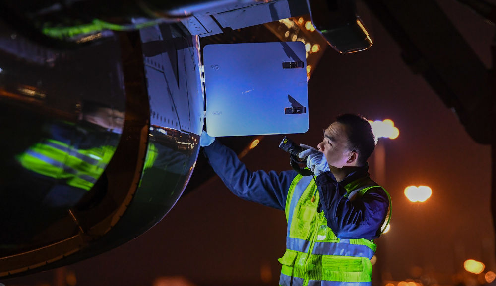 1月11日,在海口美蘭國(guó)際機(jī)場(chǎng)停機(jī)坪上,南航工程技術(shù)分公司機(jī)務(wù)工程師對(duì)飛機(jī)進(jìn)行深度檢查。新華社記者 楊冠宇 攝