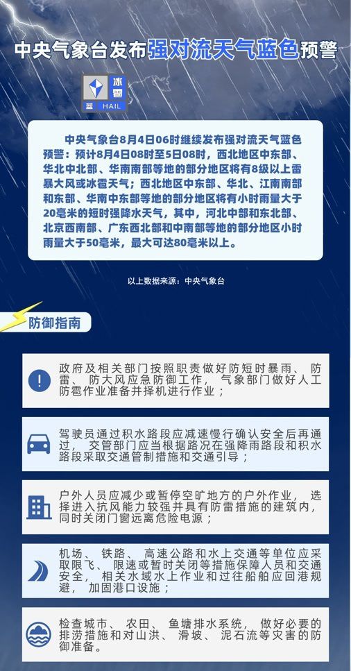 8月4日6時(shí),中央氣象臺(tái)發(fā)布暴雨橙色、高溫橙色、強(qiáng)對(duì)流藍(lán)色三預(yù)警: