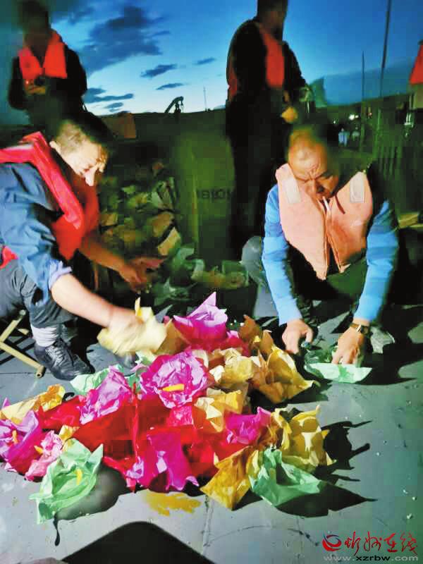一盞盞花燈放入河中。色彩艷麗的河燈順著黃河主航道向前漂移,燈點(diǎn)綴河,河簇?fù)頍?,無(wú)比壯觀。從早先放365盞燈,到現(xiàn)在的3650盞燈,場(chǎng)面更加宏大輝煌。