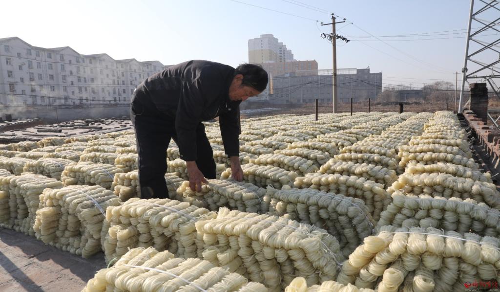 12月23日,原平市新原鄉(xiāng)班村老賈粉條加工廠內(nèi),老賈正在打捆制作好的粉條。老賈加工粉條已有30多個年頭,生產(chǎn)的傳統(tǒng)手藝無添加劑綠色粉條,很受市民青睞,不僅占領(lǐng)了本地市場,還遠(yuǎn)銷大同、包頭,產(chǎn)品供不應(yīng)求。 (褚 震 攝)