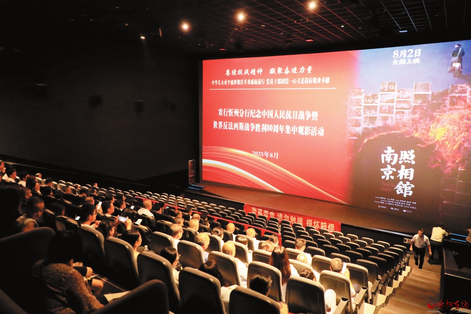 為紀(jì)念中國(guó)人民抗日戰(zhàn)爭(zhēng)暨世界反法西斯戰(zhàn)爭(zhēng)勝利80周年,8月22日,農(nóng)行忻州分行組織市分行機(jī)關(guān)及城區(qū)支行的黨員干部聯(lián)合開展了以“賡續(xù)抗戰(zhàn)精神,凝聚奮進(jìn)力量”為主題的黨日活動(dòng),并集體觀看了電影《南京照相館》。(殷俊攝) (責(zé)任編輯:盧相?。?/span> |