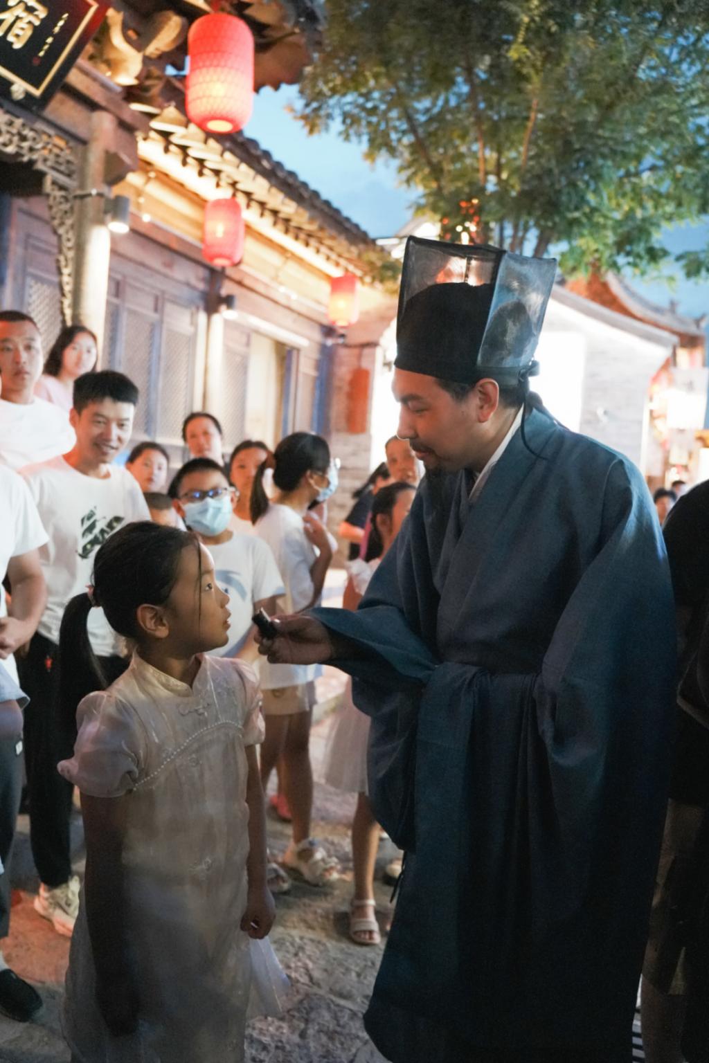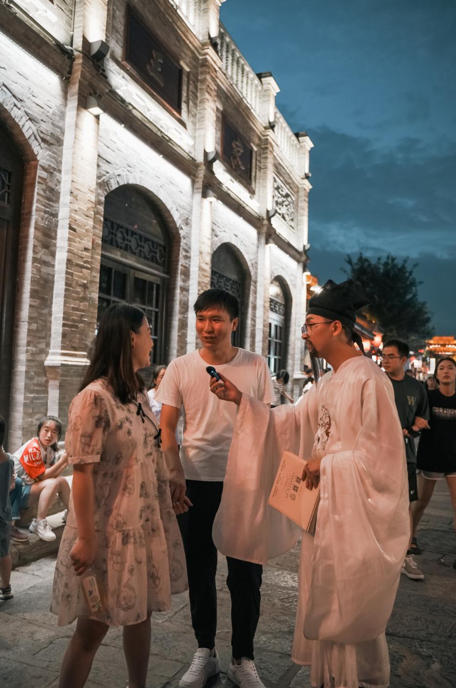 游客在忻州古城與“元好問(wèn)”、“秀容先生”吟詩(shī)作賦。源自忻州古城公眾號(hào) 52歲的張玉全憑著對(duì)茶具的獨(dú)特感情,在東大街開(kāi)了家紫廬茶具博物館,展出了多年收藏的古陶瓷茶具、老茶葉以及文玩字畫(huà)?!耙圆┪镳^為載體,致力于挖掘忻州本地茶文化,繼而為忻州文旅事業(yè)助力?!睆堄袢珜?duì)自己的博物館有著清晰的定位。 年輕人對(duì)文化的創(chuàng)新與傳承也不缺乏想象。周末,網(wǎng)紅“小黑”搖身一變成為“元好問(wèn)”,在街頭與游人玩“古詩(shī)對(duì)答”的游戲;80后的任浩將現(xiàn)代生活融入相聲,搬上了怡笑堂的舞臺(tái);在《遇見(jiàn)秀容》的劇場(chǎng),一群年輕人上演著忻州兒女不畏艱辛、逐夢(mèng)復(fù)興的光輝歲月……這些都是歷史文化與現(xiàn)代創(chuàng)意的結(jié)合。還有隨處可見(jiàn)的非遺小店、文創(chuàng)空間、國(guó)潮角落在豐富古城文化的同時(shí),也讓古城有了更多“潮”元素、新玩法,為城市注入鮮活生動(dòng)的生命力。