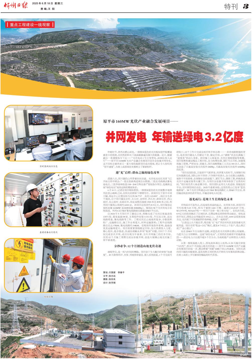 “項(xiàng)目攻堅(jiān)階段,正值原平氣候多變,雨多霧大的時節(jié),為保障目標(biāo)任務(wù)圓滿完成,團(tuán)隊(duì)以時不我待、只爭朝夕的勁頭,全力克服山高路險(xiǎn)、地勢不平的困難,在保障安全的前提下,緊盯節(jié)點(diǎn),倒排工期,積極推進(jìn)光伏片運(yùn)輸安裝等關(guān)鍵工作,為項(xiàng)目全容量并網(wǎng)爭取到了寶貴的時間?!表?xiàng)目部負(fù)責(zé)人楊亞賽介紹。項(xiàng)目團(tuán)隊(duì)運(yùn)用無人機(jī)巡檢、智能監(jiān)控平臺,實(shí)時掌控場區(qū)動態(tài)。2025年盛夏來臨,這里的荒山已變身“藍(lán)色能源?!薄?8個光伏方陣通過6回35kV集電線路匯入220kV升壓站,再經(jīng)輸送線直供經(jīng)濟(jì)開發(fā)區(qū),年輸送綠電3.2億度。