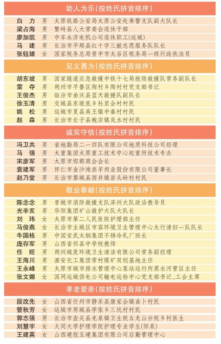 本報(bào)訊(記者李煉)近日,記者從省文明辦獲悉,經(jīng)各市、省直各工委文明辦推薦,省文明辦研究,2023年下半年“山西好人”評選揭曉。
