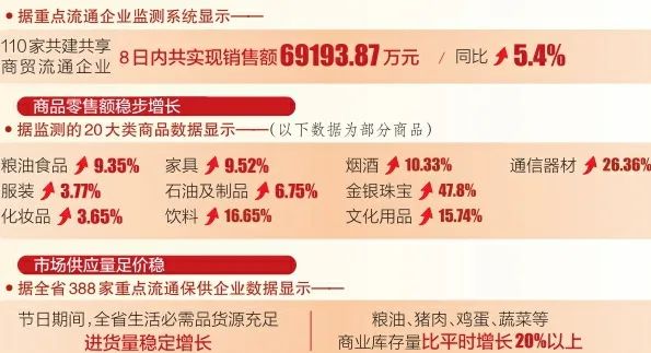 商品零售額穩(wěn)步增長。各市結(jié)合消費(fèi)者追求綠色健康、彰顯個(gè)性多樣、青睞科技智能等方面的消費(fèi)新需求,通過發(fā)放政府電子消費(fèi)券或指導(dǎo)商圈集聚營銷、品牌商品展銷、特色商品促銷等形式,持續(xù)拉動(dòng)消費(fèi)增長。據(jù)了解,全省各大商場(chǎng)節(jié)日禮盒、時(shí)令水果、糖果糕點(diǎn)、地方土特產(chǎn)、健康保健品、牛奶、飲料、煙酒等銷售旺盛。據(jù)監(jiān)測(cè)的20大類商品數(shù)據(jù)顯示,糧油食品、服裝、化妝品、家具、石油及制品同比分別增長9.35%、3.77%、3.65%、9.52%和6.75%;飲料、煙酒、金銀珠寶、文化用品、通信器材等實(shí)現(xiàn)了兩位數(shù)以上的增長,分別為16.65%、10.33%、47.8%、15.74%和26.36%。