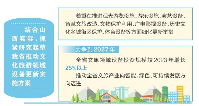 系統(tǒng)推進(jìn),夯實(shí)重點(diǎn)任務(wù)。結(jié)合山西實(shí)際,抓緊研究起草我省推動(dòng)文化旅游領(lǐng)域設(shè)備更新實(shí)施方案,著重在推進(jìn)觀光游覽設(shè)施、游樂(lè)設(shè)施、演藝設(shè)備、智慧文旅改造、文物保護(hù)利用、廣電影視設(shè)備、歷史文化名城街區(qū)保護(hù)、體育設(shè)備等方面細(xì)化更新舉措,明確更新提升重點(diǎn),力爭(zhēng)到2027年,全省文旅領(lǐng)域設(shè)備投資規(guī)模較2023年增長(zhǎng)25%以上,推動(dòng)全省文旅產(chǎn)業(yè)向智能、綠色、可持續(xù)發(fā)展方向邁進(jìn)。