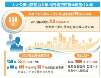 太原市高度重視人才工作,大力實(shí)施人才強(qiáng)市戰(zhàn)略,不斷創(chuàng)新人才政策,優(yōu)化人才生態(tài),為各類人才提供廣闊的發(fā)展舞臺(tái)。作為太原市的核心城區(qū),萬柏林區(qū)搶抓打造人才高地的重大機(jī)遇,精心建設(shè)拎包入住、設(shè)施齊全、服務(wù)優(yōu)質(zhì)的高品質(zhì)人才公寓。550套公寓住房包括450套55平方米的公寓、105平方米和157平方米的家庭套房各50套,能滿足人才的個(gè)性化居住要求。除此之外,還配有7000多平方米的服務(wù)配套空間,包括人才服務(wù)中心、影院、餐廳、書吧、健身房、創(chuàng)客空間等。
