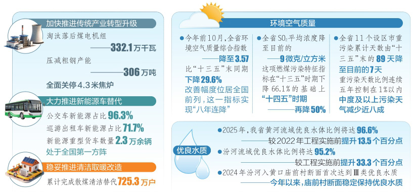 在深入推進(jìn)藍(lán)天保衛(wèi)戰(zhàn)方面,強(qiáng)化多污染物協(xié)同控制和區(qū)域協(xié)同治理,建立汾河谷地、太原盆地聯(lián)防聯(lián)控機(jī)制,開展夏季臭氧削峰、秋冬季大氣污染綜合治理等攻堅行動。2024年,全省環(huán)境空氣質(zhì)量綜合指數(shù)降至4.30,較2020年下降17.0%;PM2.5濃度降至36微克/立方米,下降21.7%;優(yōu)良天數(shù)比例達(dá)到74.2%,提升3.2個百分點。