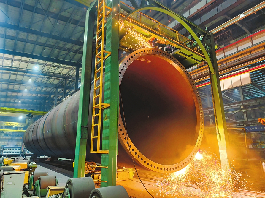 1月19日,在省級裝配式建筑產(chǎn)業(yè)鏈“鏈核”企業(yè)山西鋼構(gòu)科工有限公司智能制造車間內(nèi),一臺巨型壓力容器正進行焊接作業(yè)。輥道與龍門架穩(wěn)穩(wěn)托舉著數(shù)十米長的鋼構(gòu)件,自動化系統(tǒng)實時監(jiān)測焊縫質(zhì)量,全力保障昔陽、陽曲、廣靈、屯留等地風電項目塔筒制作。 賈曉瑞 王宇攝