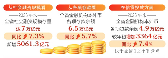 從社會融資規(guī)??矗?025年末,全省社會融資規(guī)模存量達7萬億元,同比增長7.3%;新增5061.3億元。其中,投向?qū)嶓w經(jīng)濟的本外幣貸款和政府債券凈融資增量合計占全部社融增量的94.4%。