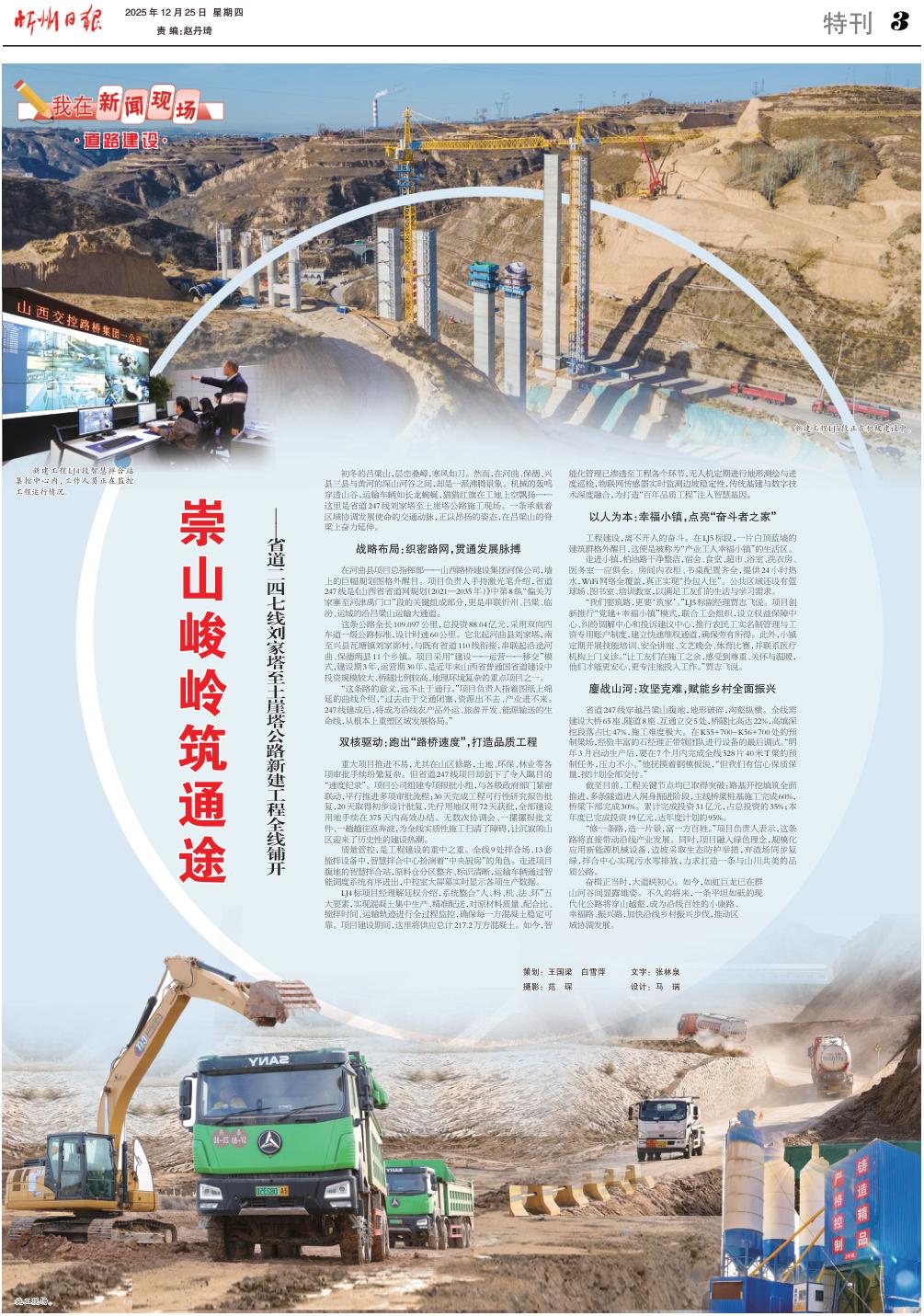 初冬的呂梁山,層巒疊嶂,寒風如刀。然而,在河曲、保德、興縣三縣與黃河的深山河谷之間,卻是一派沸騰景象。機械的轟鳴穿透山谷,運輸車輛如長龍蜿蜒,獵獵紅旗在工地上空飄揚——這里是省道247線劉家塔至土崖塔公路施工現(xiàn)場。一條承載著區(qū)域協(xié)調(diào)發(fā)展使命的交通動脈,正以昂揚的姿態(tài),在呂梁山的脊梁上奮力延伸。