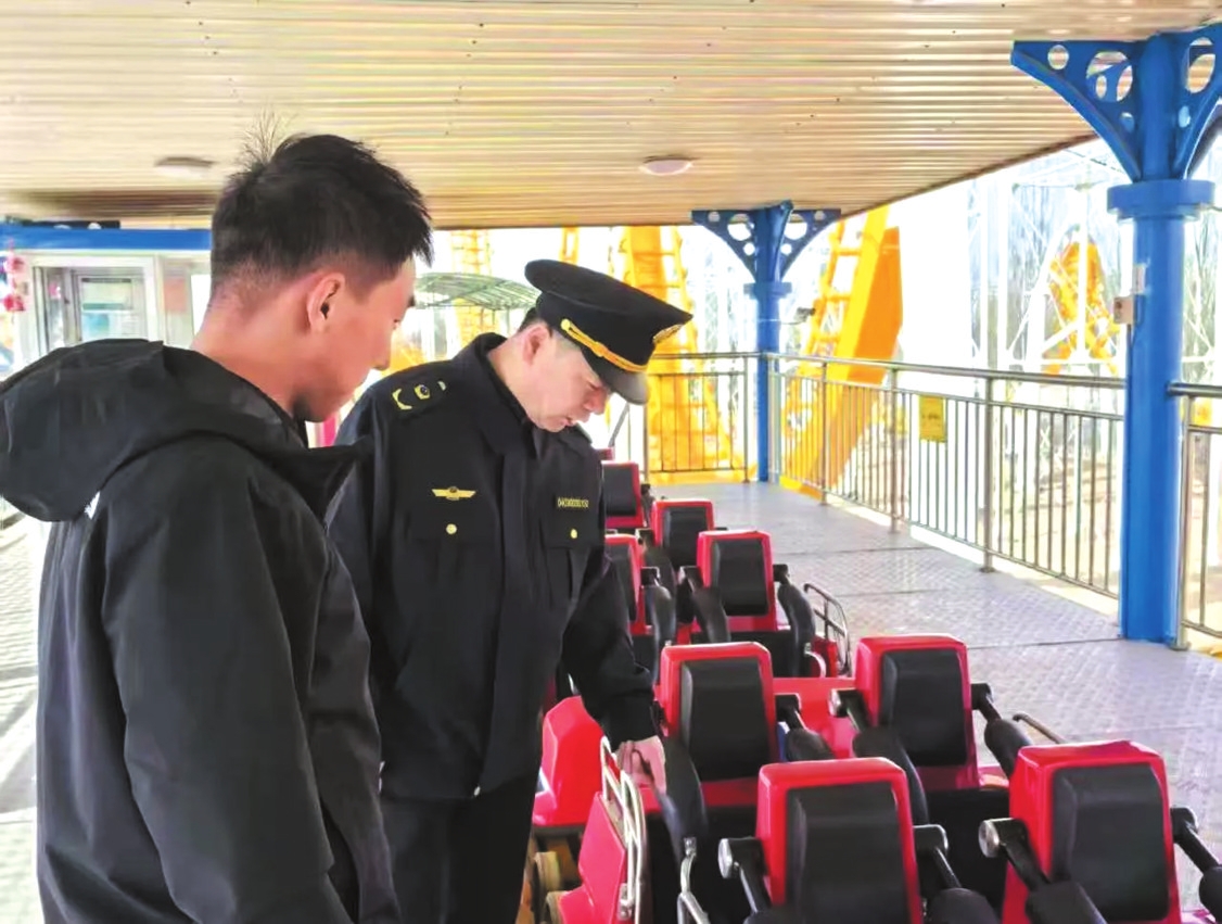圖為執(zhí)法人員深入一線,檢查游樂設(shè)施安全狀況。