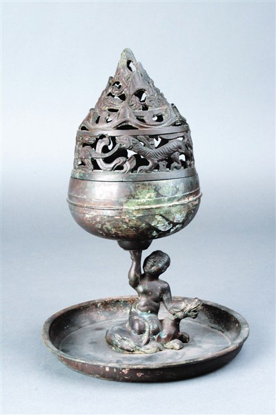 西漢鎏銀騎獸人物博山爐,河北博物館藏。1968年,河北滿城陵山二號漢墓發(fā)掘出土。在西漢,人們喜愛焚香熏煙,來驅(qū)瘟防疫,養(yǎng)生祛病。