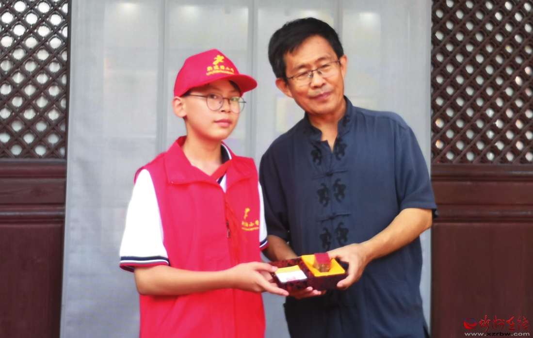 8月14日,忻府區(qū)新建路小學(xué)的史棟艇小朋友,在校長(zhǎng)陳懷林帶領(lǐng)下,來到忻州古城秀容書院博物館,將自己精心刻制的一枚“秀容書院博物館”篆刻印章,贈(zèng)送給秀容書院博物館,現(xiàn)場(chǎng)還舉行了一個(gè)簡(jiǎn)單的贈(zèng)送儀式。秀容書院博物館館長(zhǎng)梁生智鄭重地接過這枚印章,并向史棟艇同學(xué)和陳校長(zhǎng)表示了誠(chéng)摯的謝意。