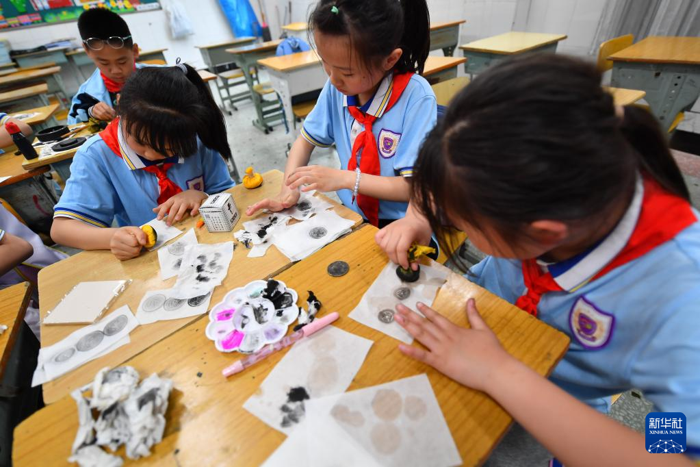 近年來,湖南省長沙市天心區(qū)紅衛(wèi)小學積極落實“雙減”政策,聯(lián)合專業(yè)機構設計了豐富的課后服務內(nèi)容,包含剪紙藝術、手工風箏、傳統(tǒng)服飾設計、趣味臉譜、景泰藍掐絲琺瑯畫、拓印、皮影戲等,讓學生零距離感受非遺,激發(fā)學生對傳統(tǒng)文化的興趣,推動非遺的傳承,助力“雙減”。(新華社記者 陳澤國 攝)