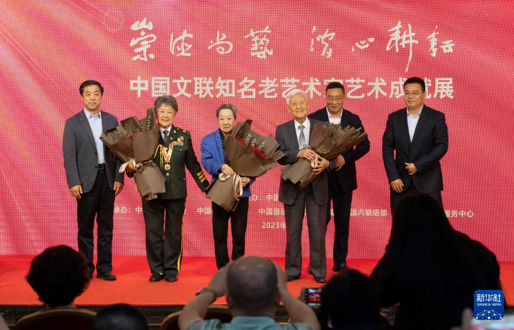 5月19日,在第六屆中國(guó)文聯(lián)知名老藝術(shù)家藝術(shù)成就展上,徐曉鐘(右三)、郭蘭英(左三)、陶玉玲(左二)三位老藝術(shù)家接受鮮花。