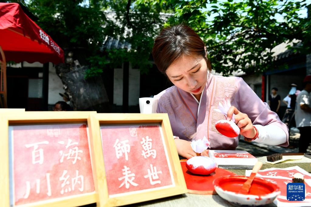 6月27日,在曲阜孔廟,工作人員在展示拓片制作。