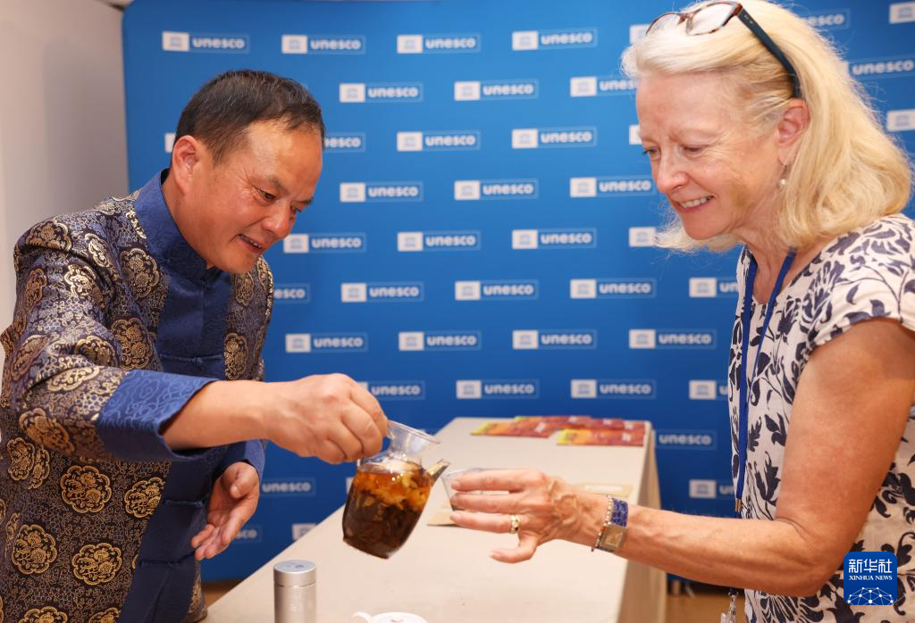 7月11日,在位于法國巴黎的聯(lián)合國教科文組織總部,嘉賓品嘗茶點。