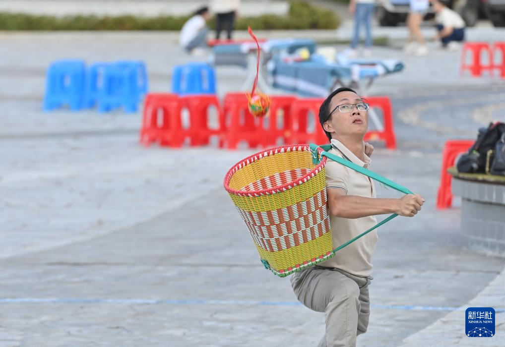 9月5日,在梧州市蒼梧縣六堡鎮(zhèn)山坪村同心廣場,選手在拋繡球比賽中。