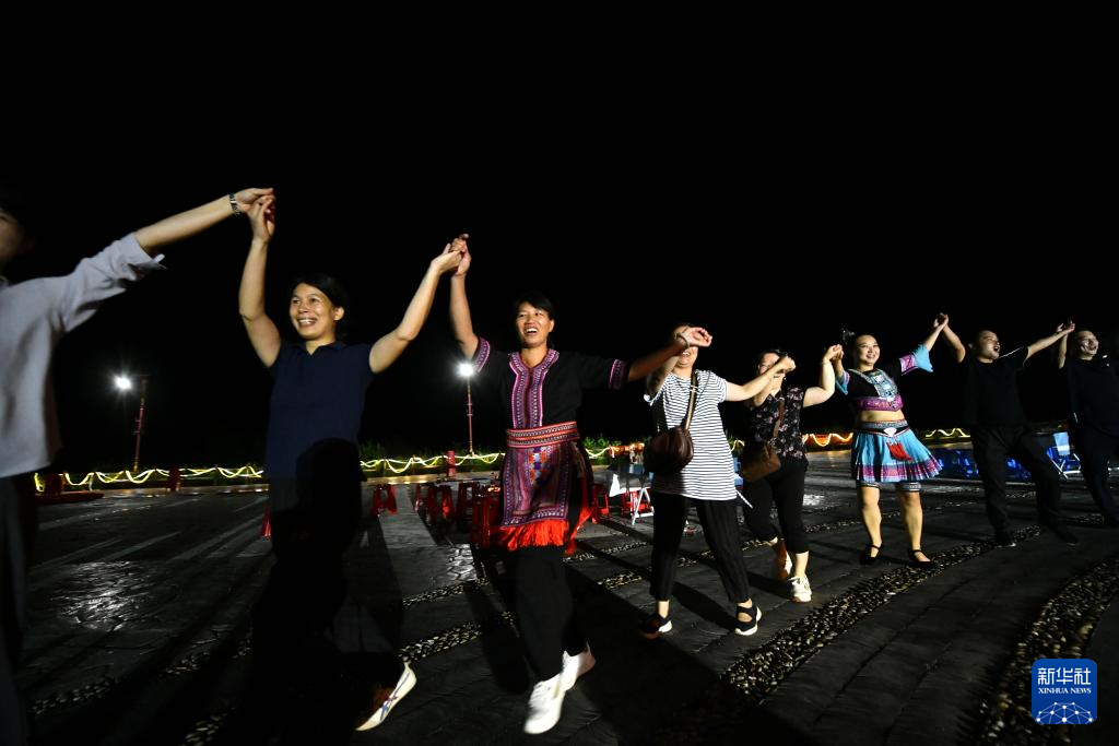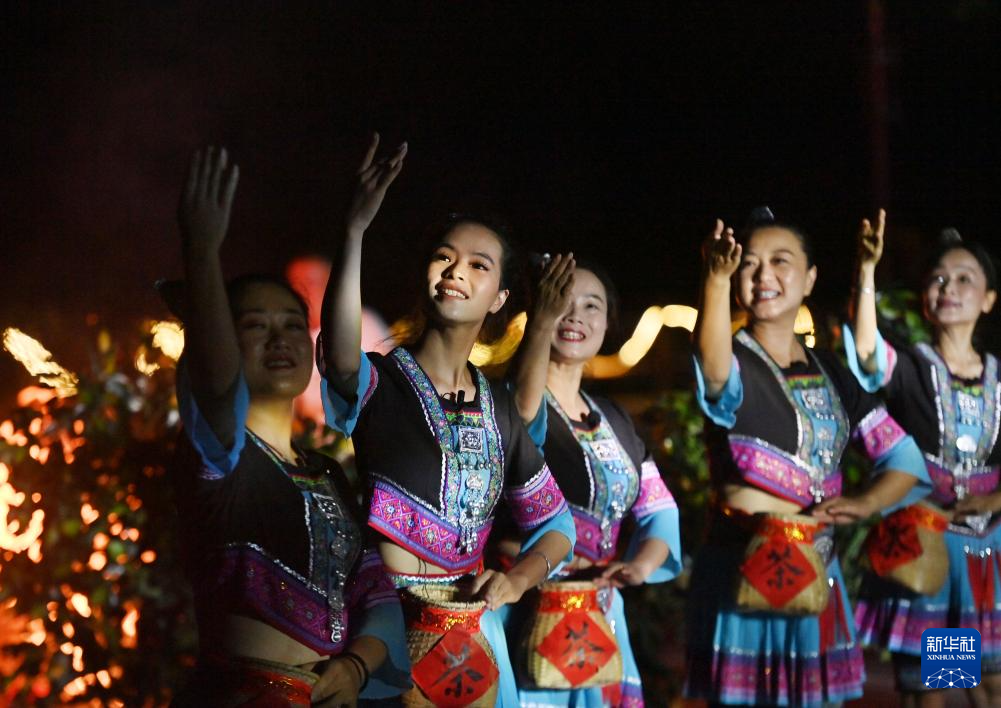 9月5日,在梧州市蒼梧縣六堡鎮(zhèn)山坪村同心廣場,各族干部群眾在篝火晚會上跳“民族團結舞”。
